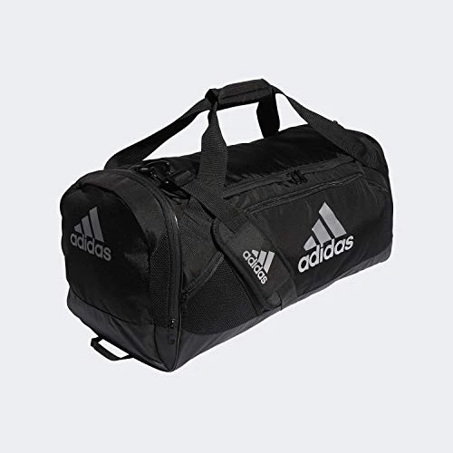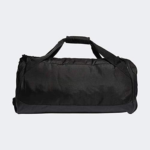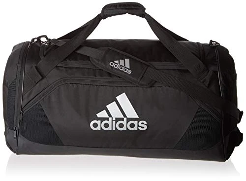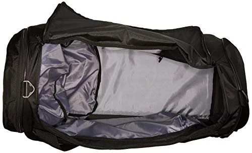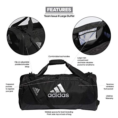 Details: Keep gear organized and separated with this large duffel bag. it’s made of durable woven fabric with a water-resistant base. it has a huge main compartment and a ventilated side pocket for wet or muddy shoes. a padded shoulder strap and padded handles make for comfortable carrying.