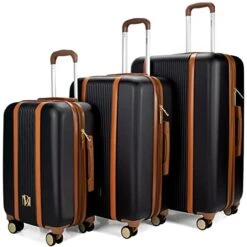 Luggage features: Made from thick ABS with a grainy texture Vintage silhouette with vegan leather and gold accents Eight spinner wheels that roll smooth, quiet, and handle heavyweights Expandable body with differentiated zipper pullers for hassle-free additional packing capacity Sturdy, telescopic, multi-level trolley 3-piece nested set 10-year limited manufacturer warranty