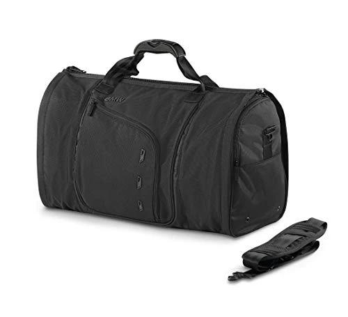 Details: High-quality bag featuring a herringbone look, with removable shoulder strap. Zipped accent pocket at the front, front pocket with three inner mesh pockets, two ventilated shoe pockets, and main compartment with zip and hook for hanging. Material: 100% polyester. Dimensions: 21.8″ x 13″ x 10″. Imported.