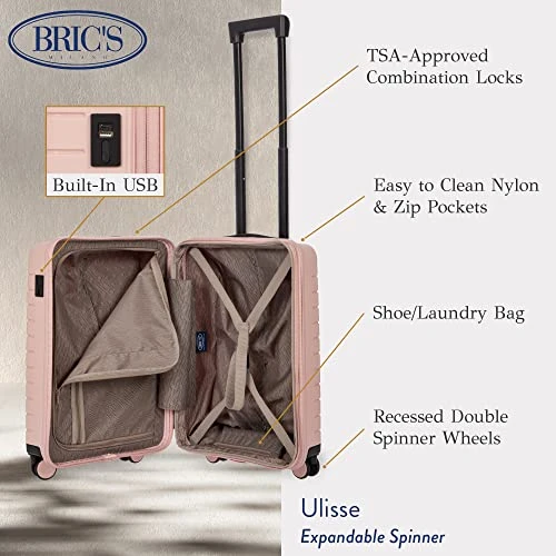 Details: Always travel in luxury and ease with the Bric’s Ulisse Spinner Suitcase. This 21 Inch carry on luggage holds all of your belongings in place and features a small pocket for personal accessories along with a shoe and laundry bag. We’ve crafted our vintage luggage with a hidden name tag, and a top carry handle with a custom cap and B|Y brand logo in matching colors. Our master lock combination bag allows American airport security to inspect your suitcases without damaging them using a universal key used only by TSA security. This roller bag measures 21″H x 14″W x 9″D, so it’s compact enough for train and car trips, making it a must-have travel staple for the sophisticated business professional who enjoys the extra perks. Take care of your carry on bag by cleaning the hard material with a non-abrasive detergent cream and light cloth.BY is a collection for the young and intelligent generation with a stylish yet urban look. We give you an essential design with consistent details that bring this contemporary and functional luggage freshness and elegance. We are inspired by the sweet moments in life where adventure and luxury meet–unlock your next journey with Bric’s designer luggage.