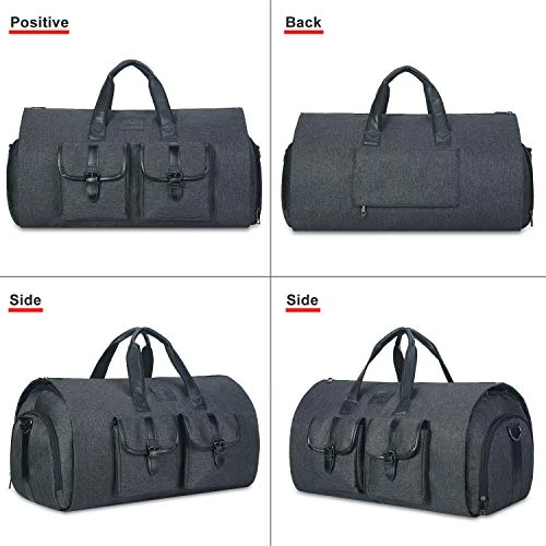 - LARGE CAPACITY DUFFEL BAG – After assembled, this garment duffel bag work perfect as a 45L duffel bag. Thanks to multiple interior zipper pockets, it maximizes storage capacity, holding everything from suits, dresses to shoes and ties For even more space, we added an exterior pocket that provides easy access to electronics and travel or business documents, so you can just focus on having a fantastic trip!