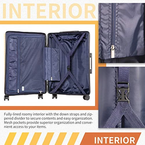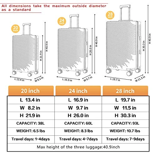 Details: Designed for the modern traveller Made of lightweight and durable PC+ABS material, this luggage is crafted to resist impact. Soft touch top and side carry handles provide maximum comfort while travelling, and an integrated TSA-accepted combination lock will keep your belongings safe. The protective film is not problem Features of the luggage20inch is perfect carry-on, 24inch is ideal for personal or business trip. Handle: 100%pure aluminum telescoping handle for comfortable maneuvering. Wheels: four spinner wheels allow the suitcase to move seamlessly through 360 degrees of motion. Interior: The interior is fully lined with multi-use organizational pockets make it easy for packing clothes. TSA Lock: TSA lock for peace of mind. Measures: 20inch (21.9 x 8.2 x 13.4), 24inch (16.9 x 9.7 x 26) 28inch (19.7 x 11.5x 30.3) Capacity: 20in38L , 24in60L, 28in 93L Weight: 20in 6.5lbs 24in8.3lbs 28in10.7lbs Travel days: 20in1~4days 24in4~7days 28in 7~9days