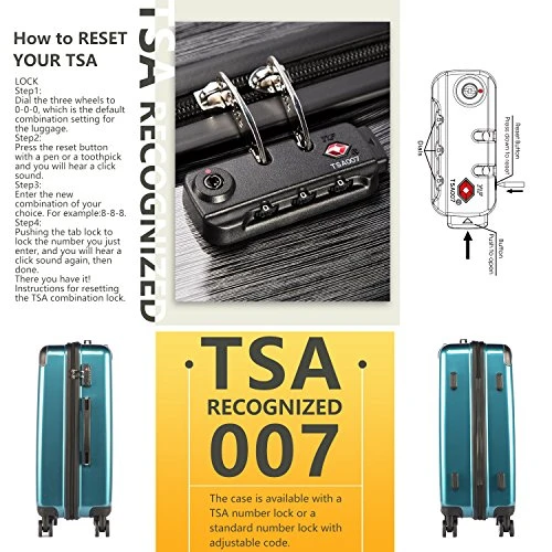 Details: Designed for the modern traveller Made of lightweight and durable PC+ABS material, this luggage is crafted to resist impact. Soft touch top and side carry handles provide maximum comfort while travelling, and an integrated TSA-accepted combination lock will keep your belongings safe. Additional features include an expandable main compartment(28in only) for maximum packing capacity and silent, double spinner wheels. The protective film is not problem Peel off the protective film can be a headache, However, this is not the case this time, the most difficult part had already been peeled off by the factory, like the wheel and handle area, all you need to do is peel off the main body’s protective film. As easy as pie. Features of the luggage 28inch is expandable for up to 15% additional packing capacity; 20inch is perfect carry-on, 24inch is ideal for personal or business trip. Handle: 3-step 100%pure aluminum telescoping handle for comfortable maneuvering. Wheels: four spinner wheels allow the suitcase to move seamlessly through 360 degrees of motion. Interior: The interior is fully lined with multi-use organizational pockets make it easy for packing clothes. TSA Lock: TSA lock for peace of mind. Measures: 20inch (15.4 x 8.7x 22.4), 24innch (17.3 x 9.8 x 26.4) 28inch (20.5 x 11x 30.3)(13in when it is expandable) Capacity: 20in38L , 24in60L, 28in 93L(110L when it is expandable) Weight: 20in 6.7lbs 24in8.1lbs 28in10.8lbs Travel days: 20in1~4days 24in4~7days 28in 7~9days