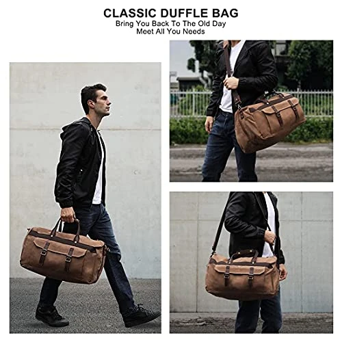 - BUILT TO LAST: Perfectly sized in 20″L * 11″W * 11.4″H that meets airline carry on luggage restrictions, the travel duffel bag is made of high density waterproof cotton canvas and genuine leather, trimmed with premium metal SBS zippers and classic bronze tone hardware, which offers the durability for long-term use. Pack Your Stuff All In One.