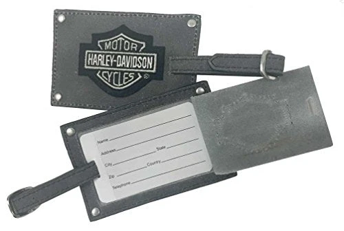 Details: Harley-Davidson Bar & Shield Belted Luggage Tags, 99301-GRAY. Set of 2 Luggage tags. Features a leather belted strap for extra strength. Privacy flap over the card holder. Each tag measures 4” x 2.5”.