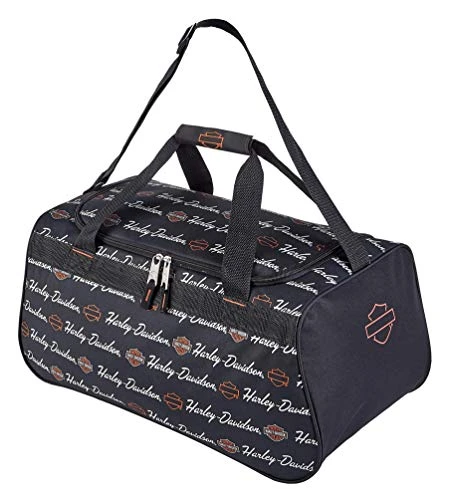 Details: Harley-Davidson Signature Sports Duffel w/ Strap, 99418-SIGNATURE. Made of lightweight, super strong water-resistant polyester. Self-healing nylon coil zippers. Industrial strength webbing should strap and handles. Rubber feet on the bottom. Interior pocket. Size: 20″ x 9″ x 10″.