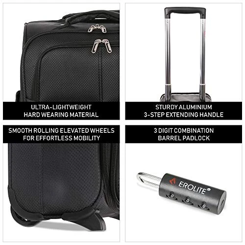 Measured height 22 inch is from the floor to the top of the top tug handle – the true height that airlines will measure your suitcase by at check-in. The double-tube retractable trolley grip handles (actioned via a push button) allow simple and easy transportation, as well as making it easy to stabilize objects placed on top. Aerolite carry on suitcases are made of lightweight & hard-wearing rip-resistant 600 denier polyester material that protects carry on bag against the rigors of traveling. Robust, smooth, chunky zippers on the main body make opening and closing the case simple, and each case includes a free 3-digit combination barrel padlock for extra security of your cabin bag.