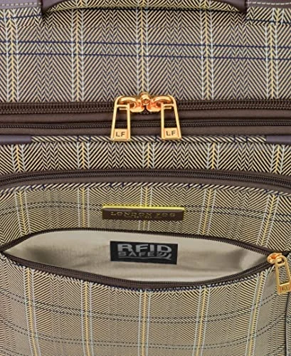 - Fog Guard protection helps repel water & stains Locking trolley handle has aluminum channel tubes for added strength Full London Fog signature lining Interior has two shoe pockets, zippered accessory pocket, zippered side mesh pocket & cargo straps