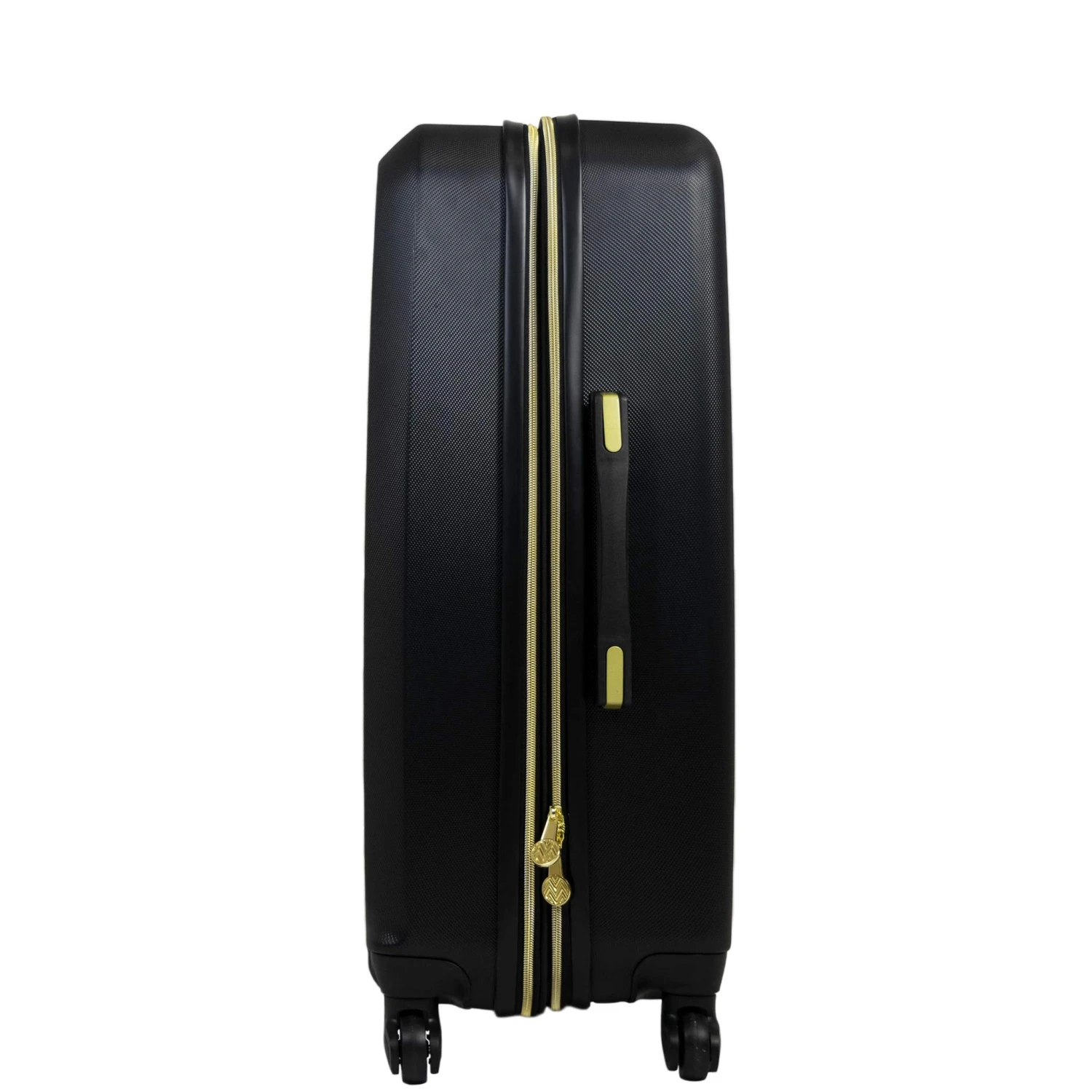 Details: The slick, upscale design of the Macbeth collection 25in black molded quilt hard sided rolling luggage makes you feel like a vip. It is made with high quality ABS plastic with a festive, quilted texture. The luggage is mobile on 360 degree multi directional spinners with a gold metallic finished telescopic pull handle. A roomy full body main compartment is perfect for everything you need on vacation with an interior zipper compartment for travel bottles. The interior also has built-in compression straps to help secure your clothing and let you pack more. It is easy to load into overhead bins and cars with retractable top and side panel handles. Easy to spot clean.