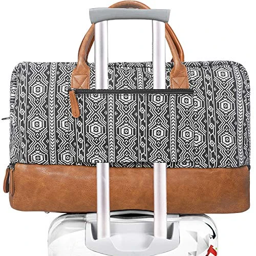 - Well-Crafted – This weekender bag is crafted with Bohemian soft canvas and PU leather shoe pockets. Added a luggage sleeve allows an easy carry, and a padded removable cross-body adjustable strap make this duffel easy to bring with you wherever you are going