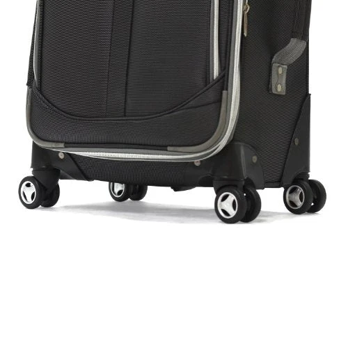 Details: OE-8825-BK Color: Black Pictured in Black Features: -Constructed of two-tone polyester. -Double wheels 360 spin allows free movement in all directions. -U tube push button retractable handle. -Expanding feature adds 20 percent more packing capacity. -Front zipper pocket and internal zipper mesh pocket for extra packing capacity. -Interior zipper pocket and dual buckle tie-belt. -Built-in dual shoe pocket. -Full interior lining. -EVA foamed front panel. -Dimensions: 28” H x 19” W x 12” D.