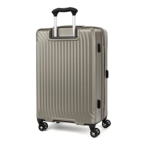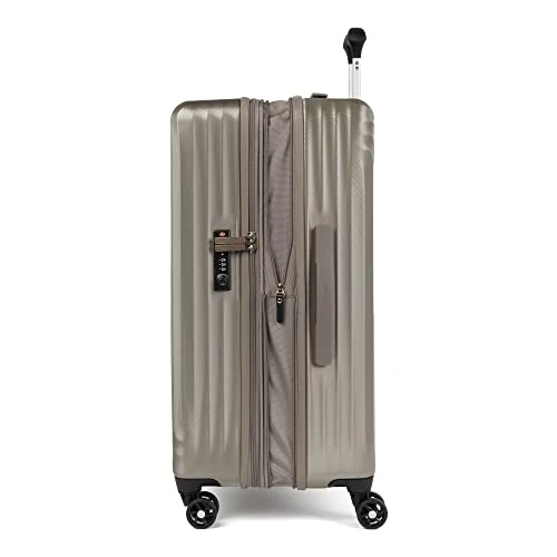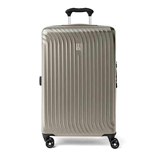 Details: Load up and check in without extra weight. The lightweight, super durable Maxlite® Air Medium Check-in Expandable Hard Shell Luggage Spinner gives you all the benefits of hardshell suitcase in resilient, well-equipped luggage, perfectly sized for medium and longer trips. This champagne luggage has 100% polycarbonate exterior engineered to flex on impact to prevent splitting, cracking or punctures, while a stylish exterior finish reduces visible scratches or scuffs. A built-in lock allows TSA authorities to safely unlock and relock the bag for inspection when needed, and a zippered expansion option maximizes packing capacity when needed. The interior lining of this medium travel suitcase with wheels is made from 100% post-consumer recycled plastic bottles to help reduce environmental waste and treated with H2O guard for moisture resistance. Two zippered interior divider panels with multiple accessory pockets keep packed contents organized, separated, and secure. Mobility on this hard case suitcase is effortless with eight smooth-gliding spinner wheels that rotate 360° led by a PowerScope Lite extension handle that locks in two positions (38” and 42.5”) to ensure a comfortable roll for users of different heights. A patented Contour Grip with rubberized touch points makes maneuvering easy and comfortable for this. This medium check-in hard luggage is backed by our Built For a Lifetime Limited Warranty with Trusted Companion Promise that even covers damage caused by airlines or other common carriers for the first year of the lifetime warranty.