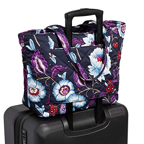 Details: Made from quilted, sleek, water-repellent polyester. Exterior features 1 slip, 1 zip, a pocket that unzips to convert to a trolley sleeve and a hidden slip at top edge. Interior features 1 zip pocket, 4 slip pockets, a padded laptop sleeve and 3 pen slips. Zip closure. Spot clean with gentle detergent. Rinse thoroughly, lay flat to dry.. Vera Bradley totes work great as a purse or a handbag, but we also offer a beach tote, a market grocery tote, a lunch tote, and a plethora of tote bag for women – we are sure to have a tote bag that fits your needs.